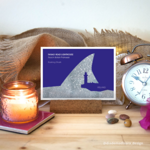 Postcard design by Sara Sirtoli. Fanad Lighthouse with a backdrop of the magnificent basking shark, second largest shark in the world, which can be found occasionally along the Donegal coast.