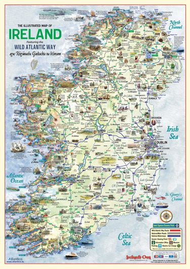 Beautifully illustrated Map of Ireland featuring the Wild Atlantic Way