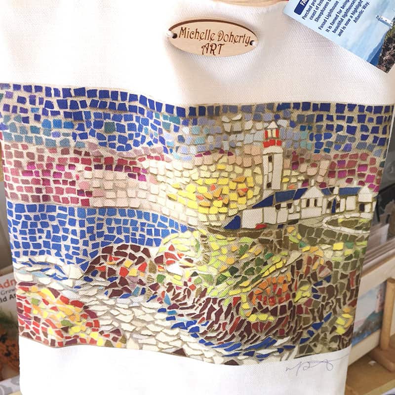 Designed by Michelle Doherty, these beautiful linen bags feature a mosaic-style Fanad Lighthouse and a wooden button with designer’s name. Red or navy canvas handles.
